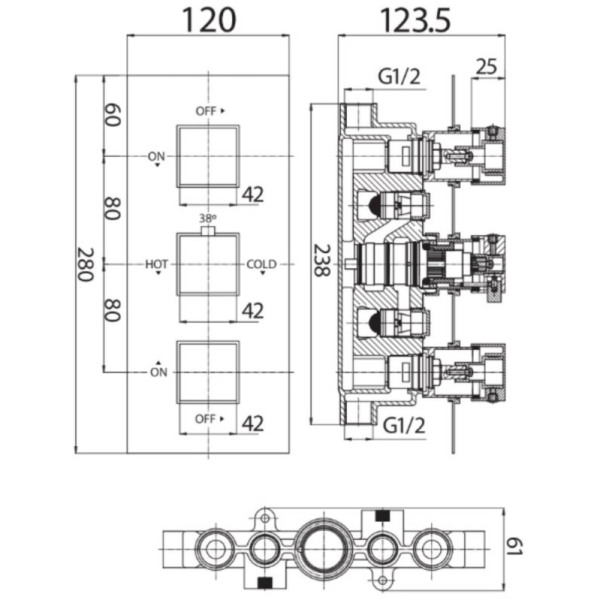 Triple Thermostatic Square Handle Concealed Valve - Black (12550)