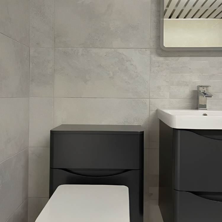 With a concrete finish, this contemporary tile adds a touch of industrial chic to your home. This aesthetic is getting more and more popular in modern homes and new builds. It looks just like real concrete, but is much more affordable and lower maintenance than the real thing.
