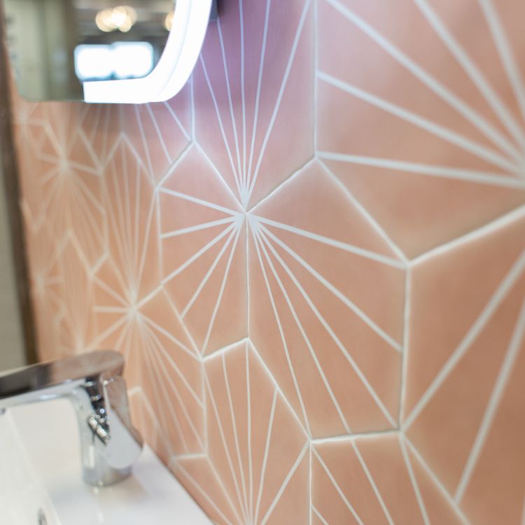 The Pink Palm Striped Hex Tile is perfect for a feature wall. The baby pink background, white striped pattern, and hex shape will rejuvenate any mid-century modern bathroom. Contrast it with a plain, solid white tile to highlight its unique finish and avoid overpowering the space.