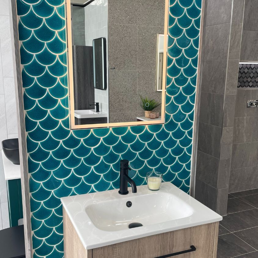 Fish scale tiles are timeless and are very high in demand. They are widely used to decorate entryways, bathrooms, kitchens, and living rooms and are perfect for that retro mid-century look. Our Atlantis Teal Mosaic Sheet looks great as a kitchen backsplash paired with wood tones or with other colours from the period such as mustard yellow. With its bold colour, glossy finish and eye-catching design, this tile has a designer edge that’s sure to steal the spotlight!
