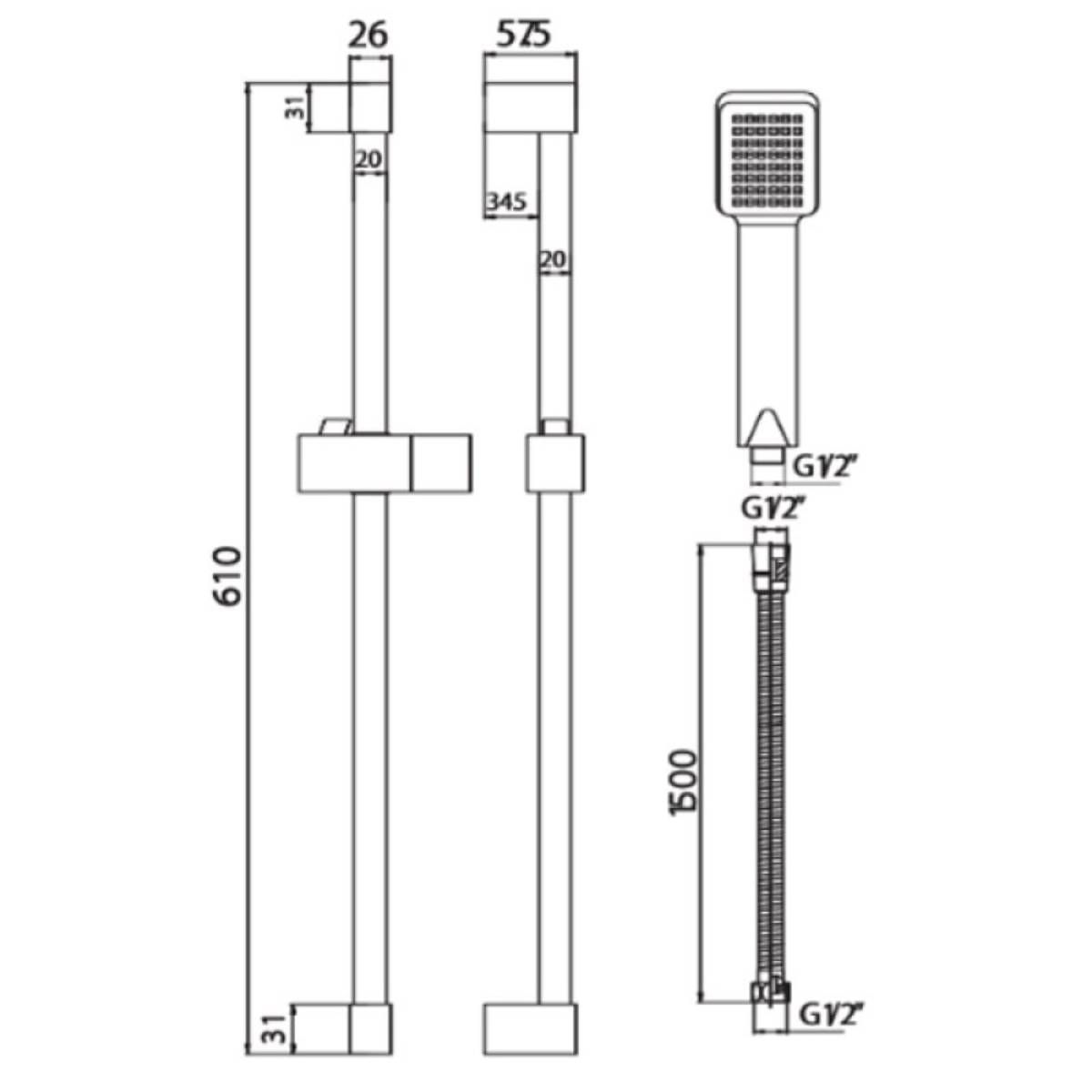 Eliseo Ricci Square Slide Rail Kit with Paddle Handset