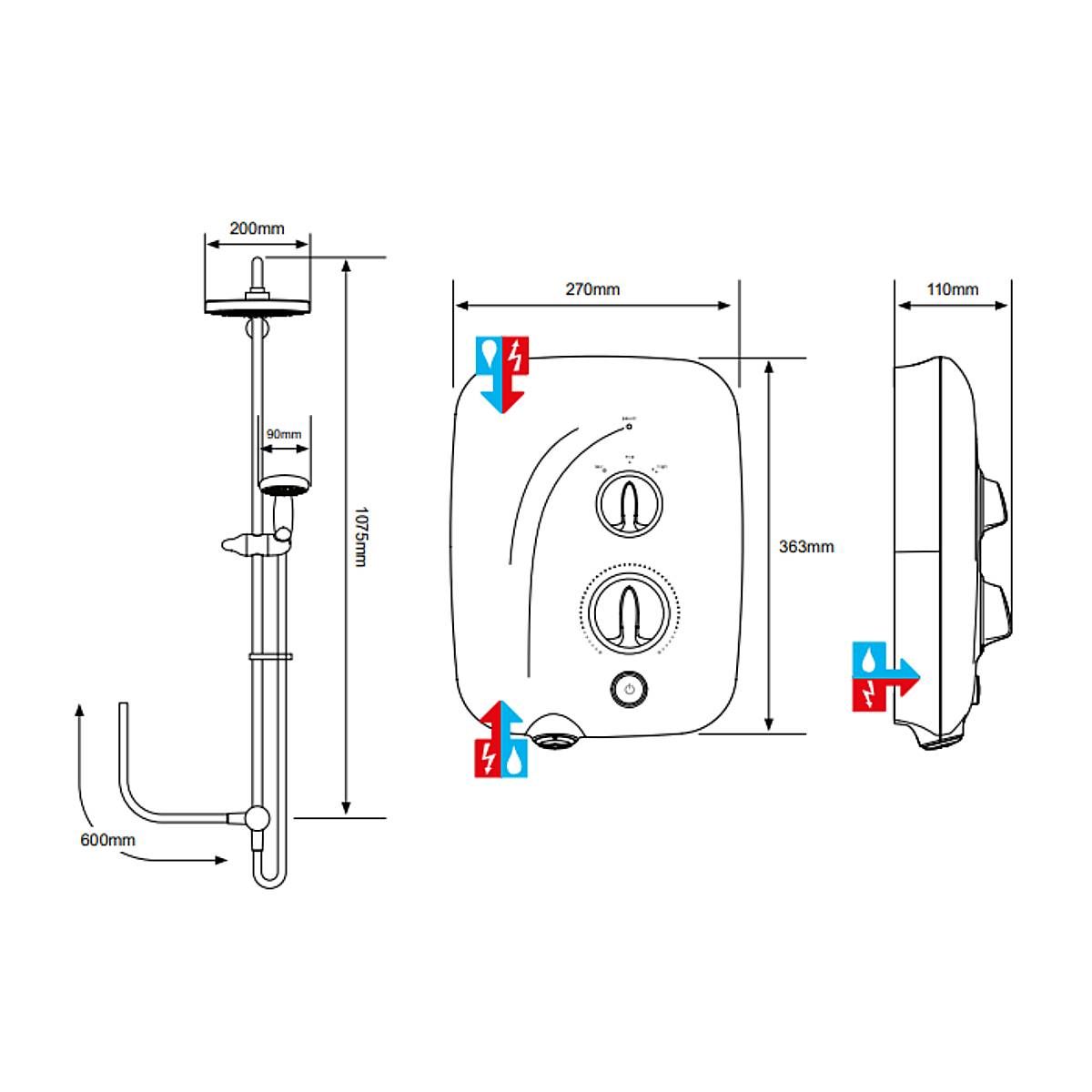 • Simple settings - On/off push button for ease of use, plus separate flow and temperature controls. Shower on demand