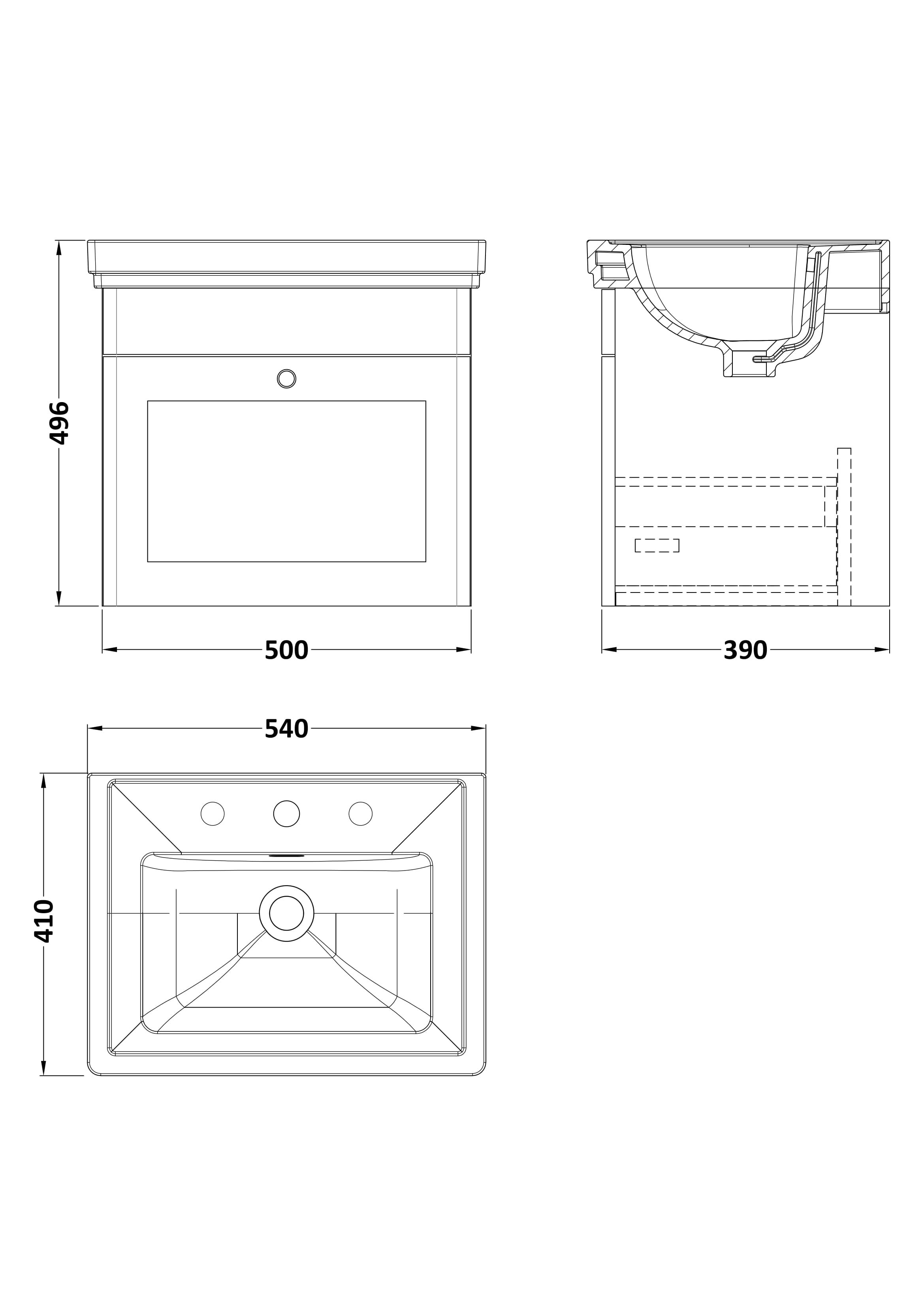 Nuie 500mm Wall Hung 1-Drawer Unit & Basin 3 Tap Holes