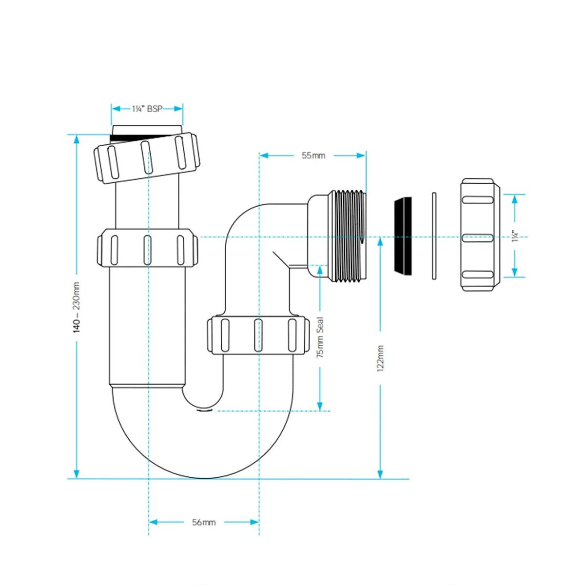 32mm P trap with a telescopic function allows the outlets height to be adjusted. Trap uses easy grip compression nuts, tapered rubber seal, rubber ‘O’ ring and slip ring.